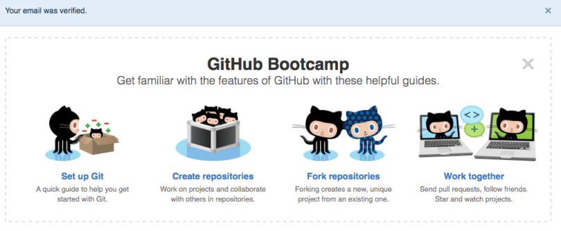 Una vez has aceptado el correo GitHub te sugiere unos tutoriales sobre las cosas que puedes hacer allí, tómalos cuando quieras.