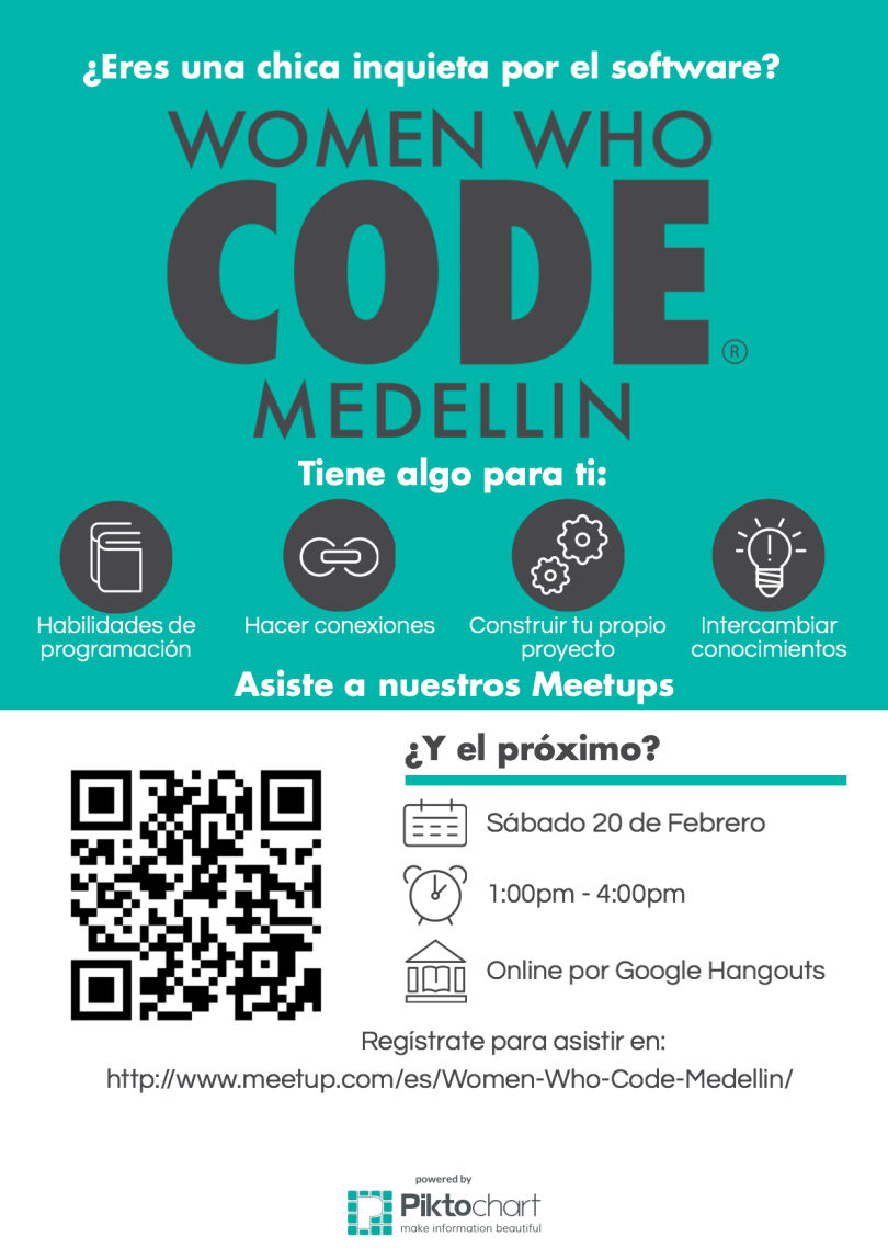 Iniciamos este año Women Who Code Medellín con un Meetup virtual, para que puedas conectarte desde donde quiera que estés en el siguiente evento de google hangout on air, el sábado 20 de febrero a la 1:00 pm.